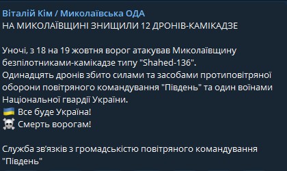 В ночь с 18 на 19 октября в Николаевской области уничтожено 12 российских дронов иранского производства "Shahed-136".