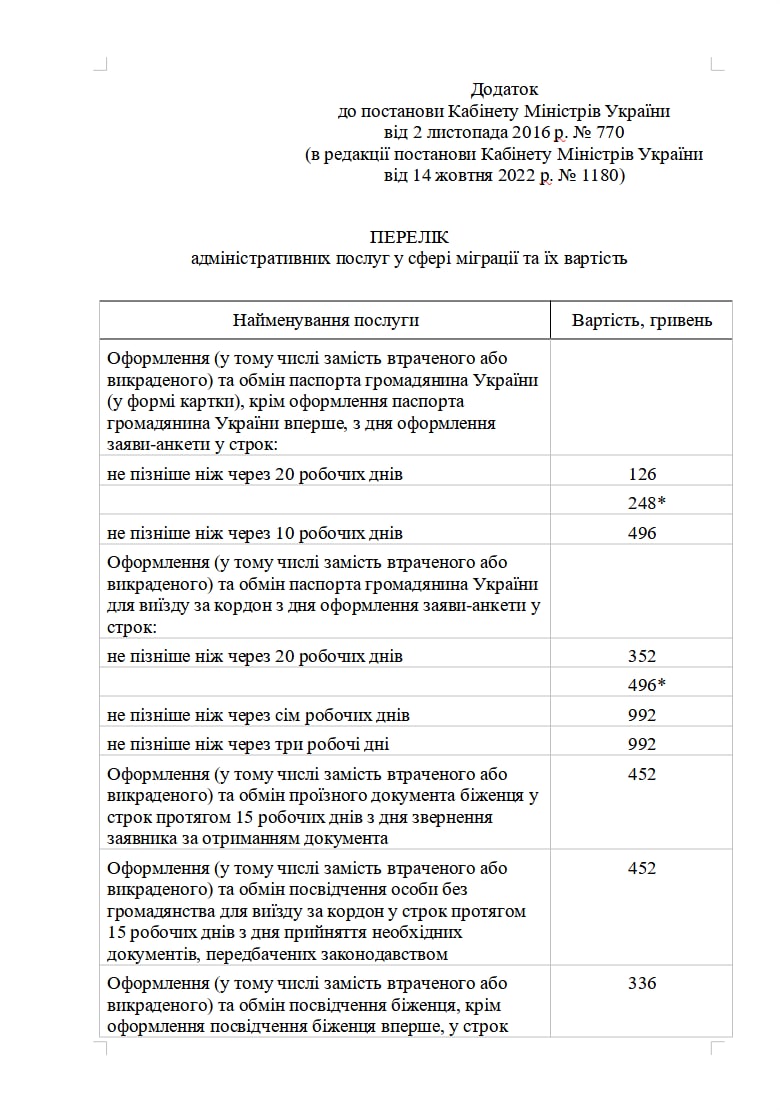 - Через шесть месяцев после отмены военного положения оформления паспорта гражданина Украины для выезда за границу за 20 дней подорожает с 352 до 496 грн.