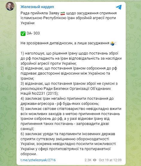 - Рада призывает мировое сообщество безотлагательно принять все возможные меры с целью прекращения поставок Ираном вооружений в РФ, а в случае отказа Ирана от прекращения таких поставок - ввести действенные санкции;