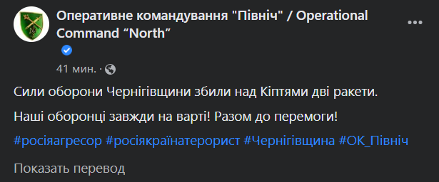 "Силы обороны Черниговщины сбили над Киптями две ракеты", - сказано в сообщении.
