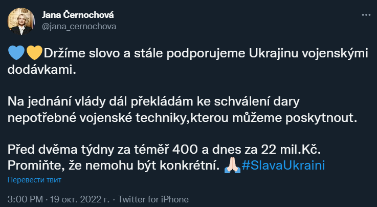 "Мы сдержали свое слово и продолжаем поддерживать Украину военными поставками. Передаю на заседание правительства для утверждения перечень ненужной военной техники, которую мы можем предоставить. Две недели назад на почти 400, а сегодня на 22 миллиона крон", - написала она.