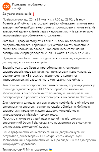 Ранее мы также сообщали, что во Львовской области сегодня, 20 октября, отключили свет для промышленности. Обычных потребителей это пока не коснулось.