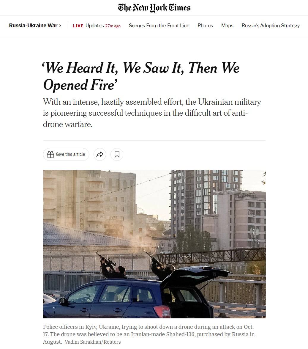 10:20 The New York Times опубликовал репортаж о борьбе с иранскими дронами в Украине. Он вышел под заголовком "Мы услышали, мы увидели, потом открыли огонь".