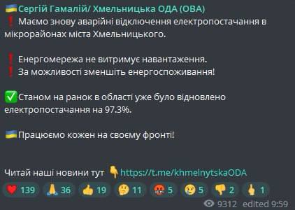 10:16 Укрэнерго вновь вводит ограничение потребления электроэнергии во многих регионах страны.