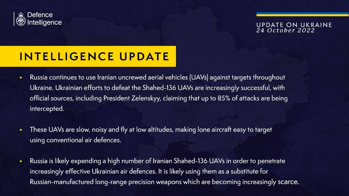 Официальные источники, в том числе президент Владимир Зеленский, утверждают, что перехватывается до 85% атак, напоминают в разведке Британии.
