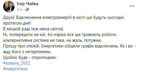 "Отключение электроэнергии в городе еще будет сегодня в течение дня! В городском совете тоже нет света... Пока все еще продолжаются работы, альтернативная система не такая, к сожалению, мощная. Энергетики обещали график отключений", - сказал Чайка.