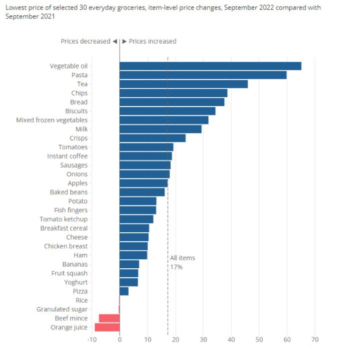 Британский офис национальной статистики Великобритании публикует официальные данные о том, какие продукты подорожали сильнее всего в королевстве за последний год.