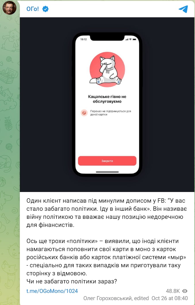 Монобанк назвал "кацапским г@вном" тех, кто пытается пополнить карты с российских счетов или системы "Мир"