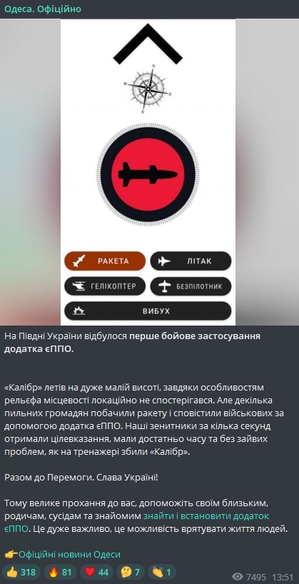 На юге Украины произошло первое боевое применение приложения "еПВО". Российская ракета "Калибр" летела на очень малой высоте, благодаря особенностям рельефа местности локационно не наблюдался.