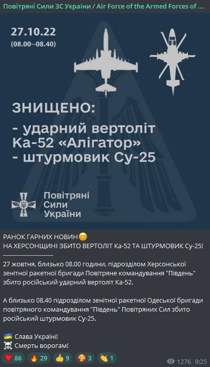 Позже, в 8:40 был сбит российский штурмовик Су-25, сообщают Воздушные силы ВСУ.