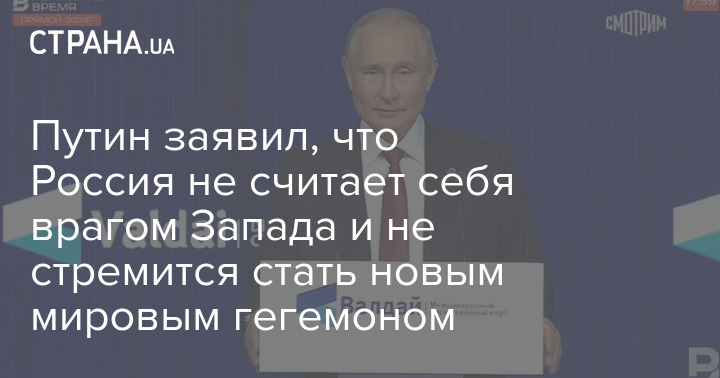 Президент РФ Владимир Путин заявил, что Россия не считает себя врагом Запада, не бросает вызов его элитам и не стремится стать новым мировым гегемоном.