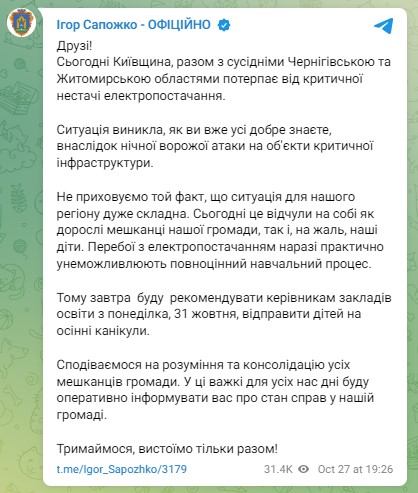 Мэр Броваров Игорь Сапожко обратился к руководителям учебных заведений и призвал их отправить школьников на осенние каникулы с 31 октября. Призыв главы города связан с дефицитом электроснабжения из-за атаки на объект критической инфраструктуры.