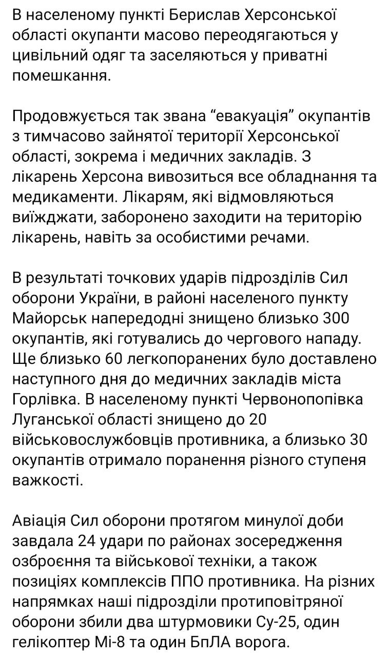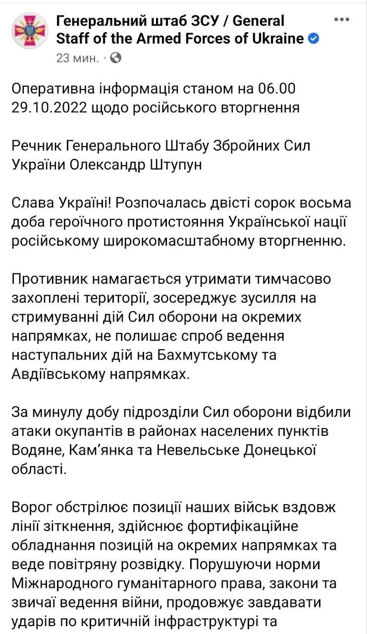 Генштаб ВСУ публикует оперативное обновление по вторжению России на 06.00 29 октября 2022 года. Главное из утренней сводки: