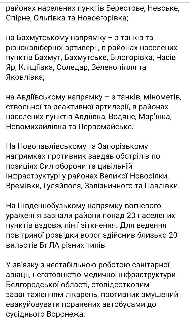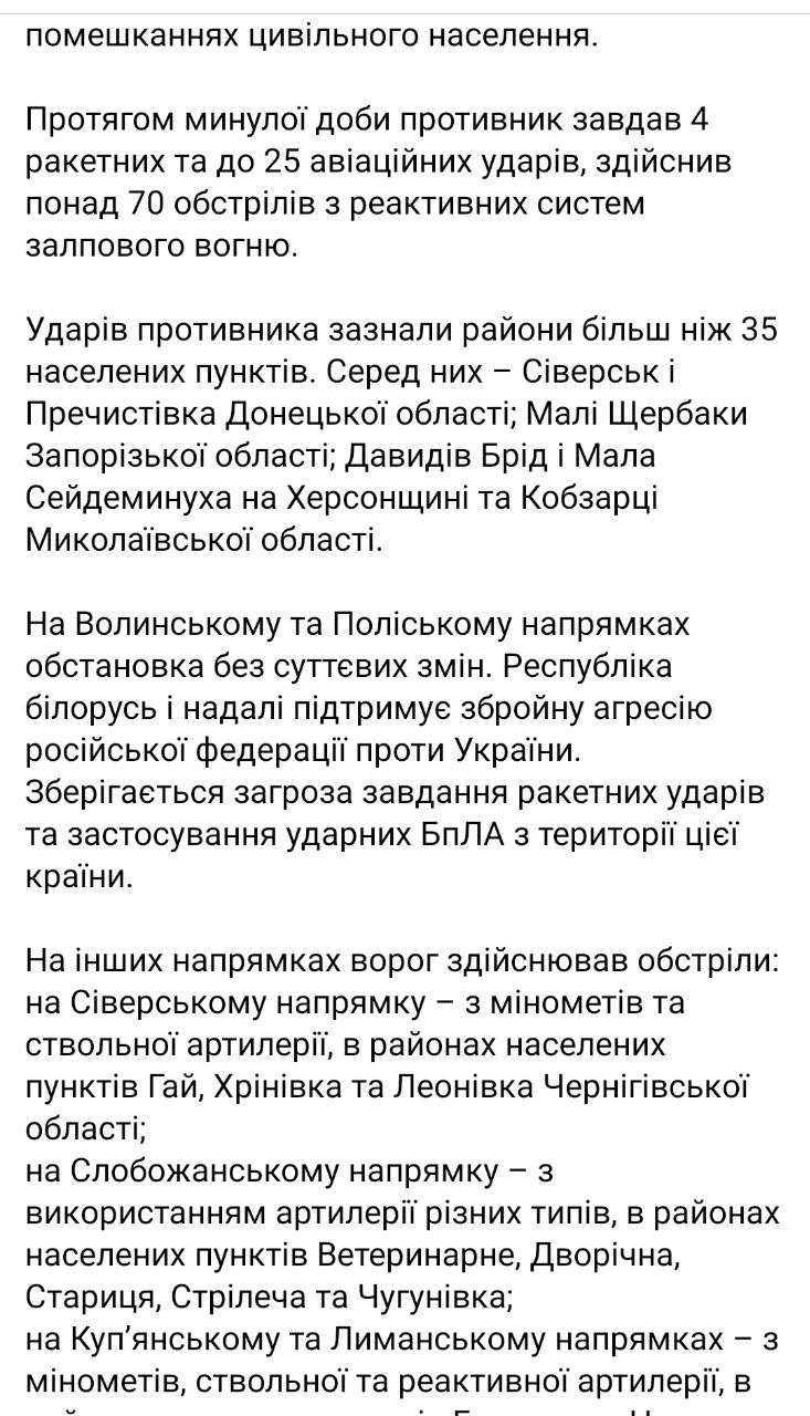 2. За прошедшие сутки противник нанес 4 ракетных и до 25 авиационных ударов, совершил более 70 обстрелов из реактивных систем залпового огня.