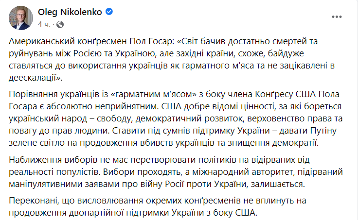 "США хорошо известны ценности, за которые борется украинский народ – свободу, демократическое развитие, верховенство права и уважение прав человека. Ставить под сомнение поддержку Украины – давать Путину зеленый свет на продолжение убийств украинцев и уничтожение демократии", – написал Николенко в Facebook, выразив уверенность, что "высказывания отдельных конгрессменов не повлияют на продолжение двухпартийной поддержки Украины со стороны США".