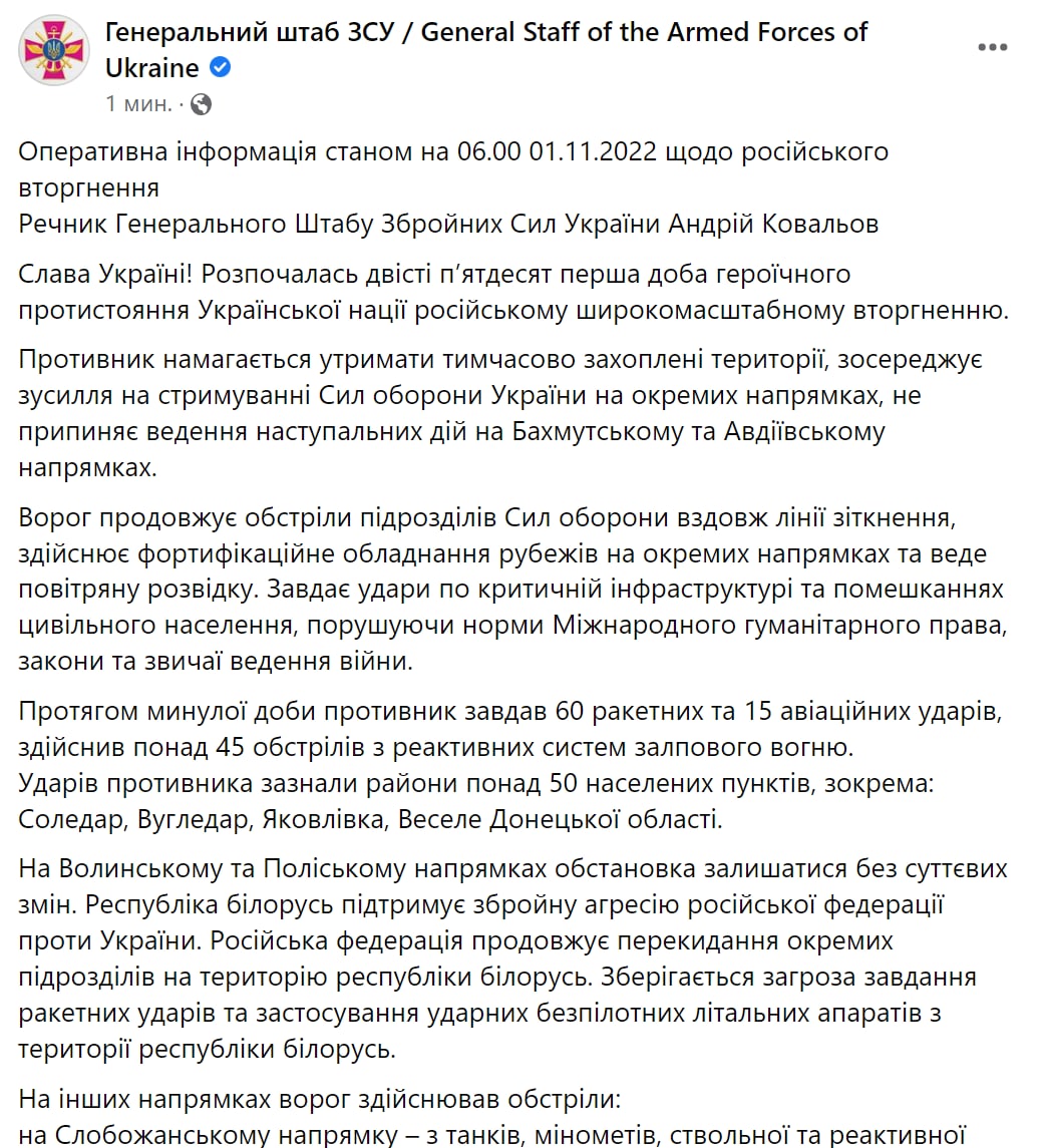 За прошедшие сутки противник нанес 60 ракетных и 15 авиационных ударов. 45 крылатых ракет сбито.