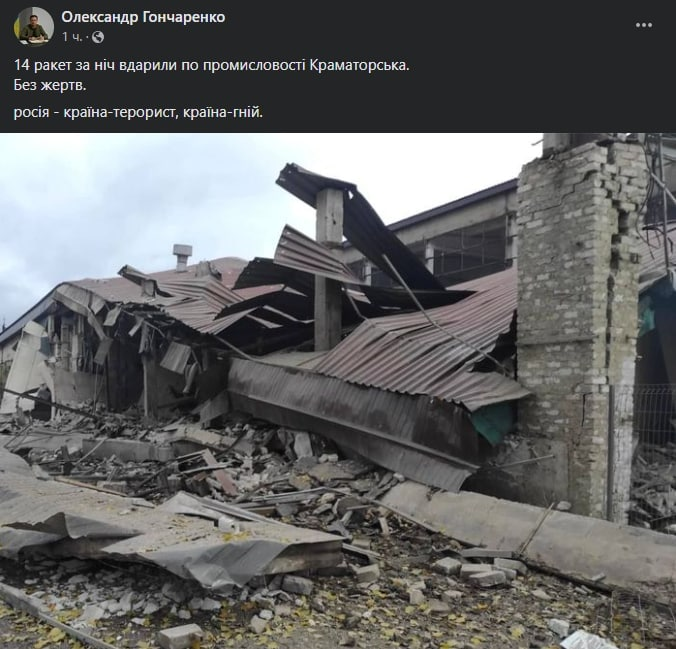 Тем временем на подконтрольной части Донецкой области обстрелу подвергся Краматорск. Россияне выпустили 14 ракет по промышленным объектам, сообщил мэр города Александр Гончаренко и опубликовал фото последствий.