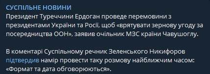 Президент Турции Реджеп Тайип Эрдоган проведет переговоры с президентами Украины и России Владимиром Зеленским и Владимиром Путиным, чтобы "спасти зерновое соглашение при посредничестве ООН".