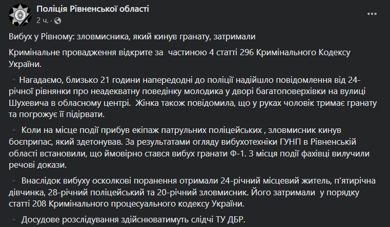 Злоумышленник, взорвавшего гранату на детской площадке в Ровно, задержан. В результате ЧП ранения получили 4 человека, в том числе ребенок и сам злоумышленник.
