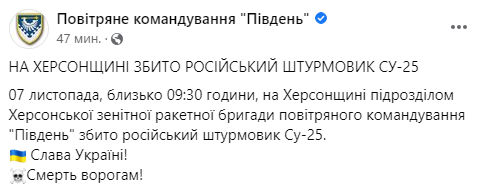 "7 ноября около 09:30 часов в Херсонской области подразделением Херсонской зенитной ракетной бригады воздушного командования "Юг" сбит российский штурмовик Су-25".