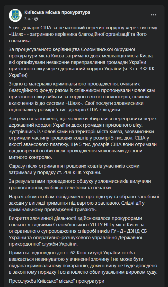 Как писала "Страна", ранее в Киеве трое мужчин за $3 тысячи отправляли призывников за границу с помощью системы "Шлях".