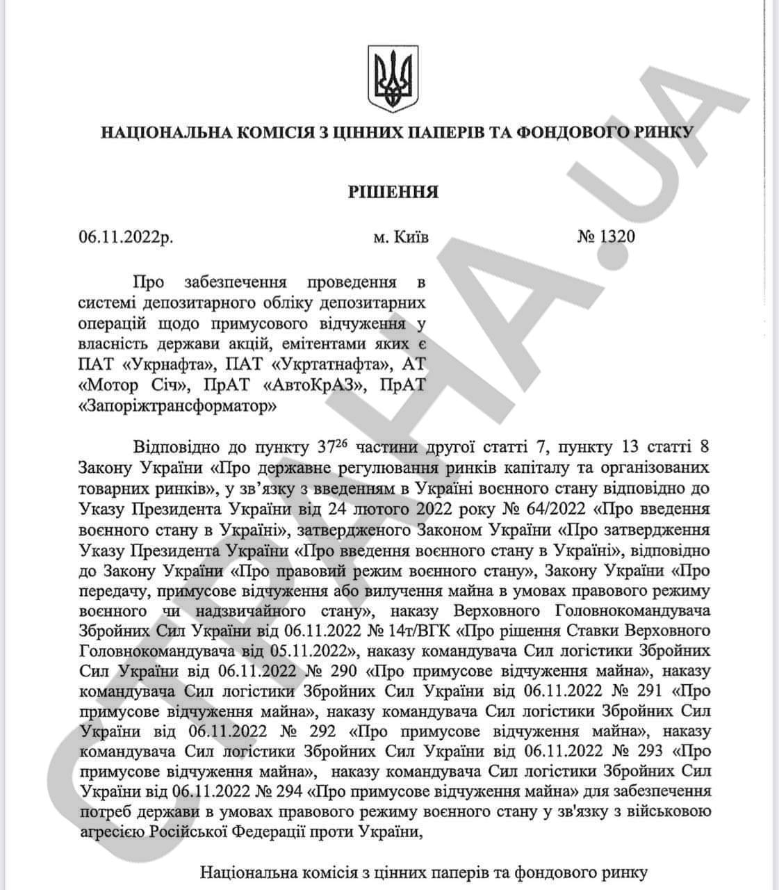 Речь идет о решении НКЦБФР по изъятию акций ОАО "Укрнефть", ОАО "Укртатнефть", АО "Мотор Сич", ЧАО "АвтоКрАЗ", ЧАО "Запорожтрансформатор".