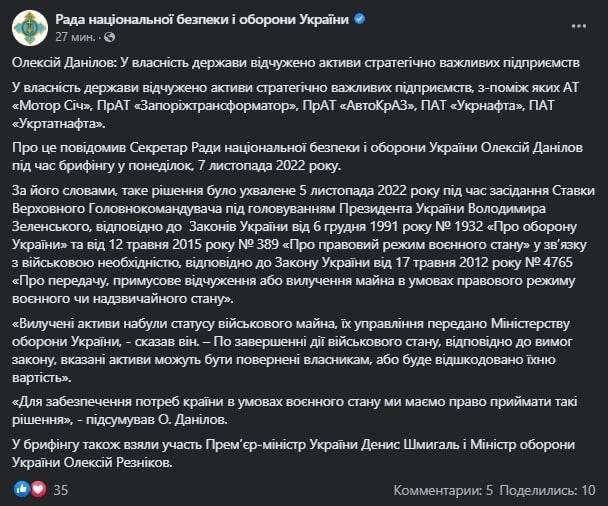 "Укрнафта", "Мотор Сич" и другие национализированные сегодня активы получили статус военного имущества и переданы Минобороны.