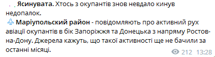 Также Андрющенко сообщил о небывалой активности авиации противника со стороны Ростова-на-Дону в направлении Донецка и Запорожья.