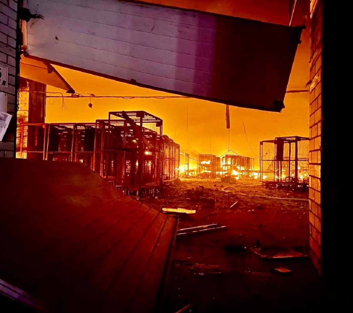 В результате попадания дрона вспыхнул мощный пожар, площадь горения составила более 3 тысяч квадратных метров. К утру спасателям удалось утихомирить пламя. Разрушены склады предприятия.