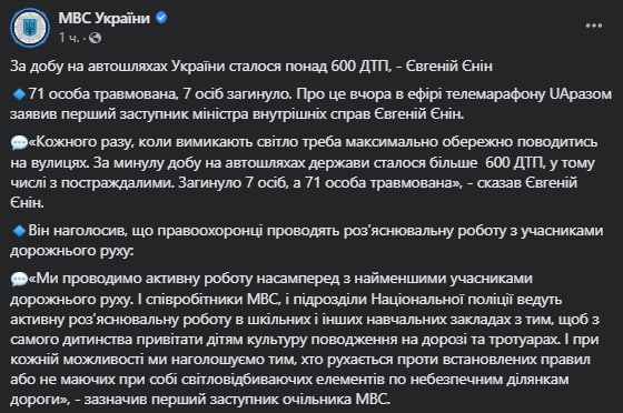 За сутки на дорогах Украины случились более 600 аварий, 71 человек травмировался, 7 человек погибли, заявил замминистра внутренних дел Евгений Енин.