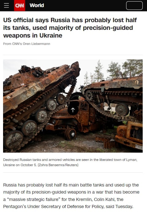"Более 80% их сухопутных войск погрязли в Украине. Они потратили большинство своих высокоточных боеприпасов, а санкции и экспортный контроль очень усложнят им восстановление своей армии до того, как это было до войны", - заявил он.