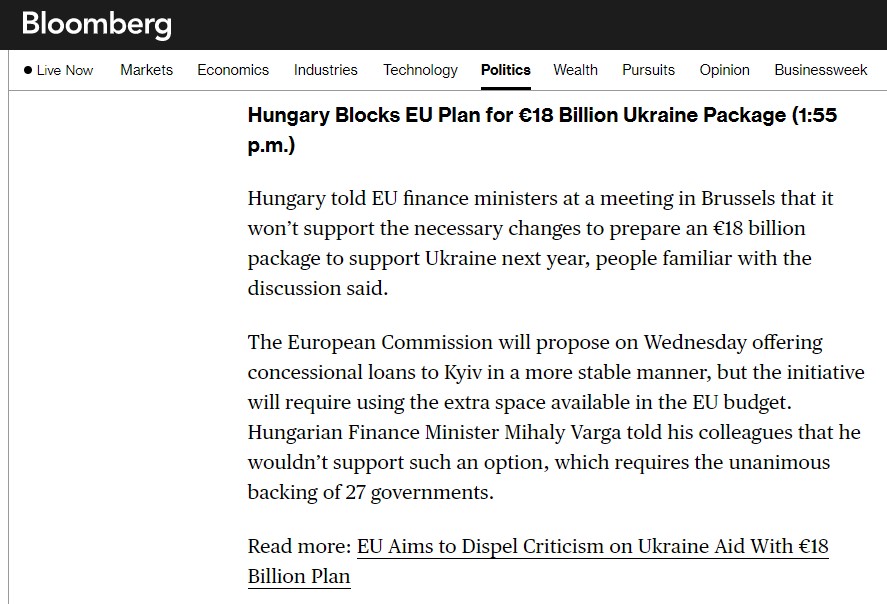 Венгрия заблокировала план ЕС по пакету помощи Украине на 18 млрд евро - Bloomberg