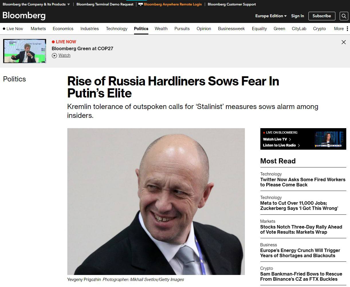 Высокопоставленные российские бизнесмены и чиновники с тревогой наблюдают за тем, как призывы Пригожина к ужесточению курса по всем направлениям благосклонно воспринимаются Владимиром Путиным, пишет Bloomberg.
