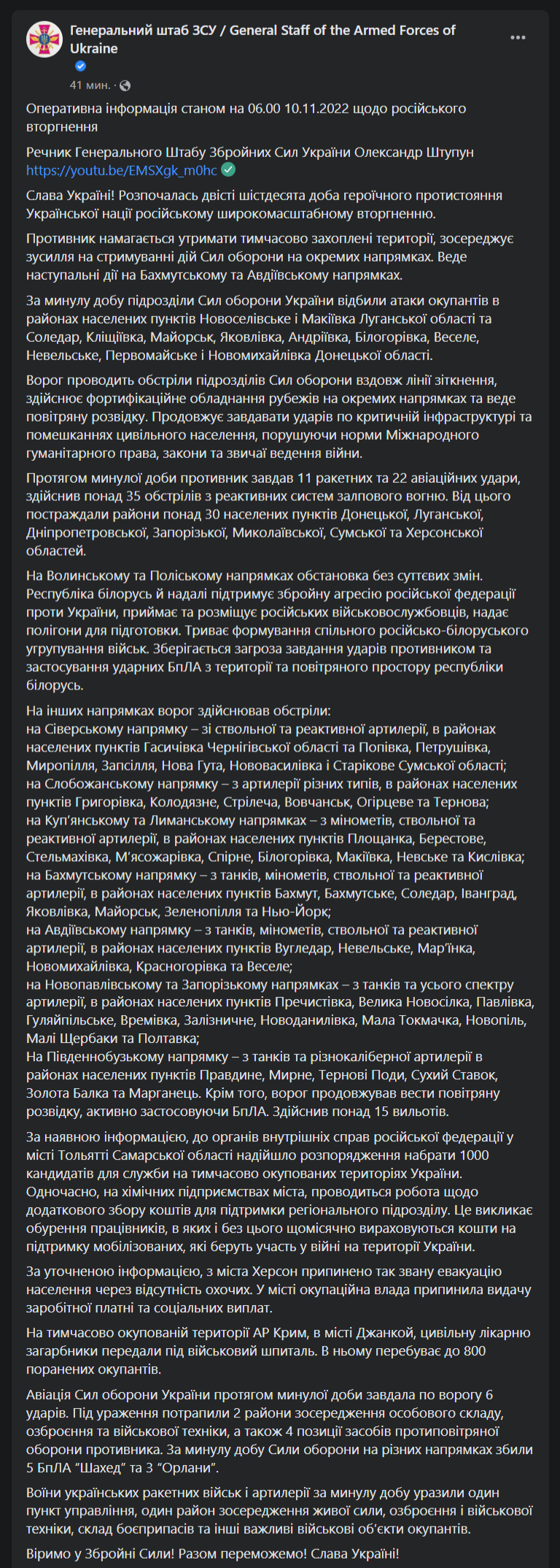 Утром в четверг, 10 ноября, Генштаб ВСУ опубликовал актуальную сводку с фронта. В ней ничего не говорится об уходе россиян из Херсонской области и о занятии оставленных ими населенных пунктов.