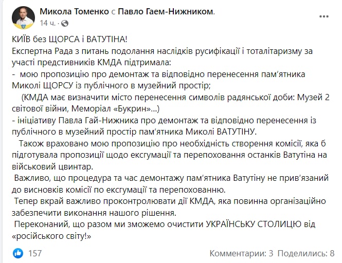 В Киеве планируют демонтировать памятники Щорсу и Ватутину, их перенесут в Музей монументальной пропаганды тоталитарного режима. Такое решение поддержал экспертный совет Минкульта по преодолению последствий русификации и тоталитаризма.