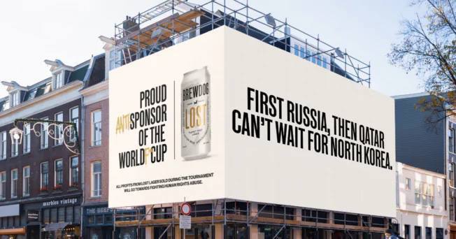 Британская сеть пабов BrewDog объявила себя "гордым антиспонсором" Чемпионата мира по футболу в Катаре, который начнется в ноябре. Она разместила провокационную серию билбордов, протестуя против притеснений прав человека в этой стране.