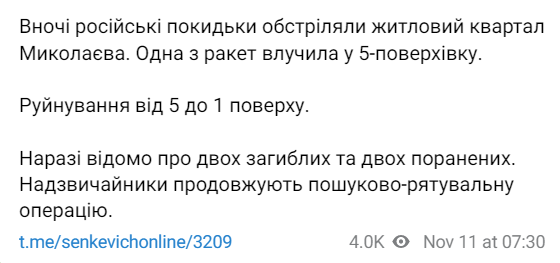 В ночь на 11 ноября россияне ударили по жилому кварталу Николаева. В результате есть погибшие и раненые.