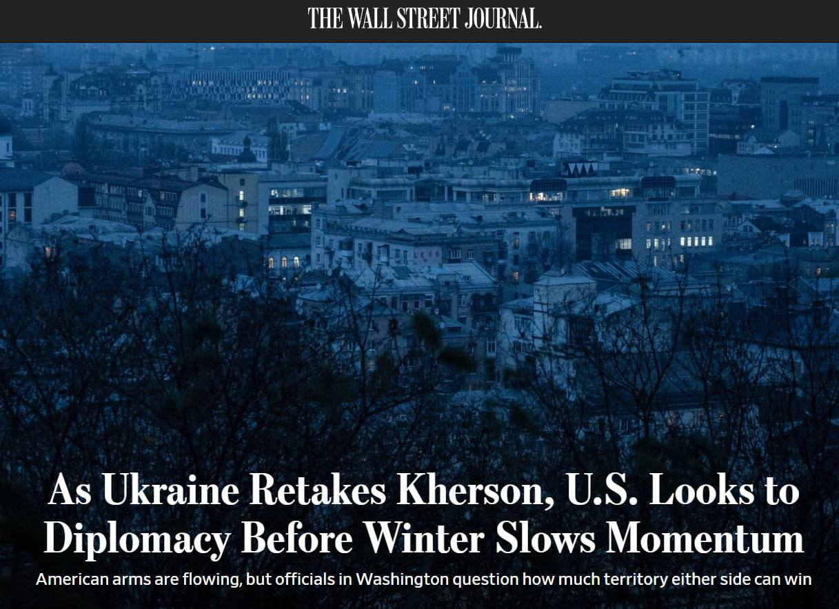 Вашингтон дал понять Украине, что Киев должен как минимум казаться открытым для переговорного решения. Советник Байдена по национальной безопасности Джейк Салливан передал это сообщение президенту Владимиру Зеленскому и его заместителям в Киеве 4 ноября. Два европейских дипломата, проинформированные о дискуссиях, заявили, что Салливан рекомендовал команде Зеленского начать думать о своих реалистичных требованиях для переговоров, включая пересмотр заявленной цели Украины по возвращению Крыма.