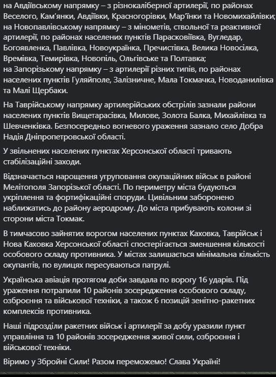 1. Отмечается наращивание группировки противника в районе Мелитополя. По периметру города строятся укрепления и фортификационные сооружения. Гражданским запрещено приближаться к району аэродрома. В город прибывают колонны техники со стороны Токмака.