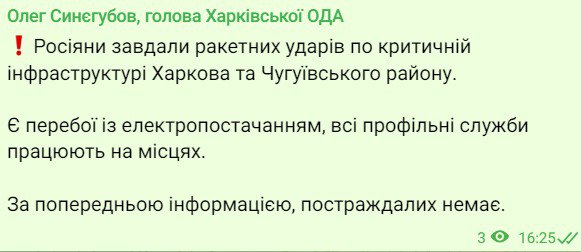 2. Нанесен массированный ракетный удар по военной и гражданской инфраструктуре нескольких областей Украины. результаты работы средств ПВО и последствия ударов противника уточняются.