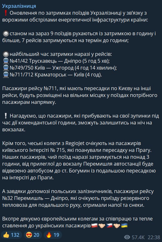 22:47 Сейчас 9 поездов в Украине движутся с задержкой в час и больше, 7 рейсов задерживаются на срок до часа.
