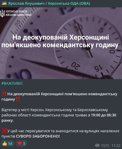 Напомним, что 12 ноября в освобожденном Херсоне ввели комендантский час с 17 часов дня.