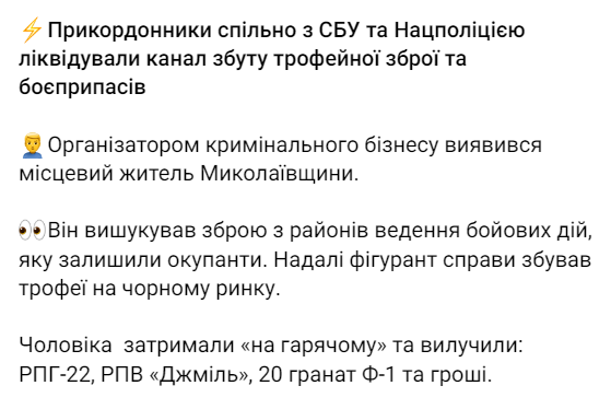 Пограничники совместно с СБУ и Нацполицией ликвидировали канал сбыта трофейного оружия и боеприпасов, который организовал 26-летний житель Николаевской области. Он выискивал оружие из районов ведения боевых действий, которое оставили россияне. В дальнейшем сбывал трофеи на черном рынке.