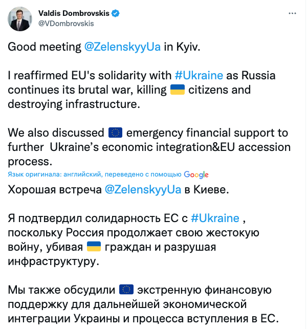 "Я подтвердил солидарность ЕС с Украиной в то время как Россия продолжает свою жестокую войну, убивая граждан Украины и разрушая инфраструктуру. Мы также обсудили экстренную финансовую поддержку ЕС для дальнейшей экономической интеграции Украины и процесс вступления в ЕС", - написал Домбровскис.