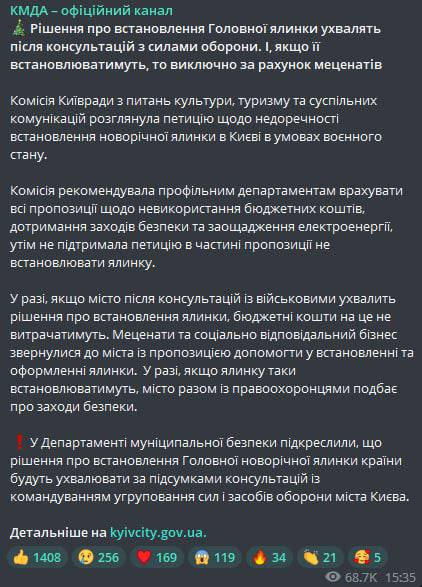 Вместе с тем, мы писали, что в Днепре, Харькове и Чернигове решили не ставить главную елку в этом году и отказались от праздничных мероприятий.