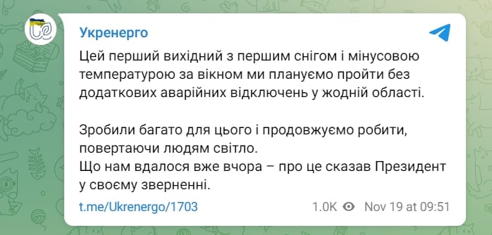 "Этот первый выходной с первым снегом и минусовой температурой за окном мы планируем пройти без дополнительных аварийных отключений во всех областях", - сообщает компания в телеграм-канале.