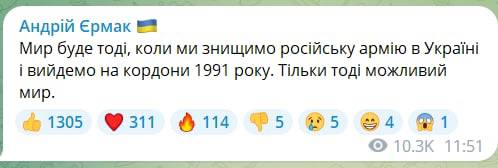 "Мир будет тогда, когда мы уничтожим российскую армию в Украине и выйдем на границы 1991 года. Только тогда возможен мир", - пишет Ермак у себя в телеграм-канале.