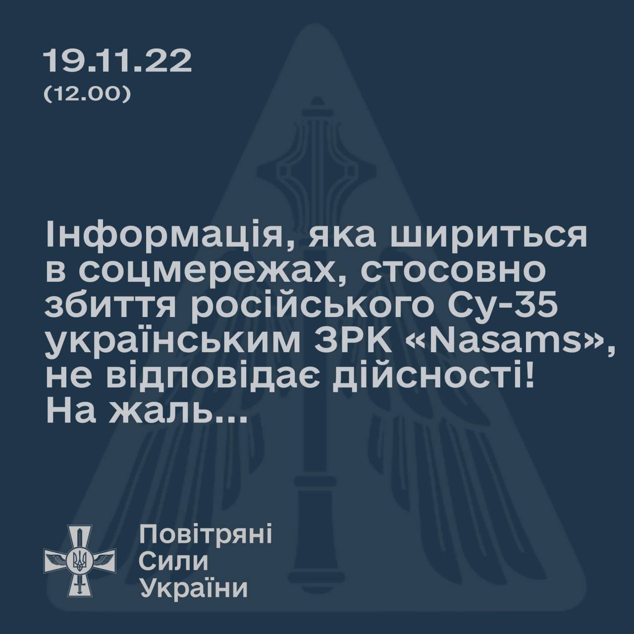 12:16 Информация о том, что под Бахмутом зенитно-ракетным комплексом NASAMS был сбит российский истребитель Су-35С, не соответствует действительности, заявляет командование Воздушных сил ВСУ.