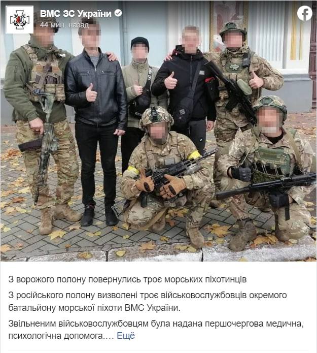 12:21 Украина вернула из плена троих морских пехотинцев, сообщают ВМС ВС Украины.