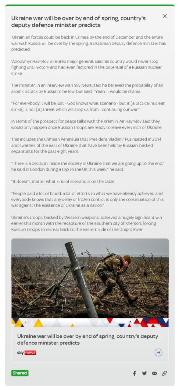 12:30 В Минобороны Украины считают, что война может закончиться к концу весны, а Крым ВСУ смогут вернуть к концу декабря.